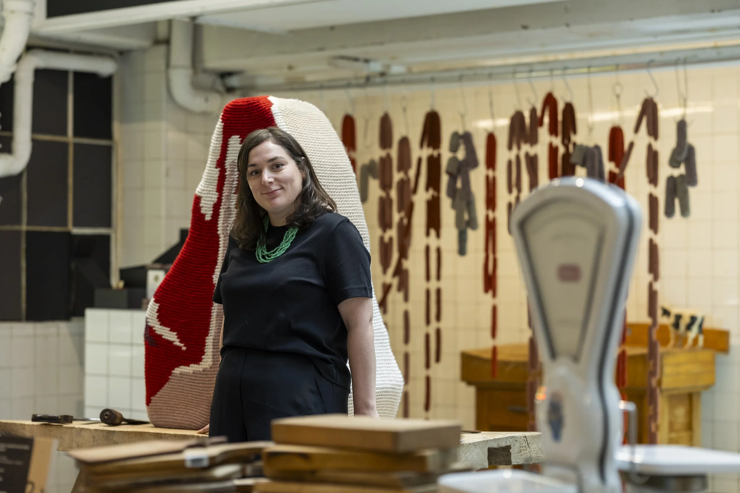 Parisian artist Clemence Joly recently created a wool butchery for Vintage Furniture and lighting brand Merchant & Found during London Craft Week … a showstopper that featured giant T-bone steaks alongside charcuterie .. each sausage lovingly knitted by hand. We speak to the Central St Martins trained artist on where her love for knitting began and what next…